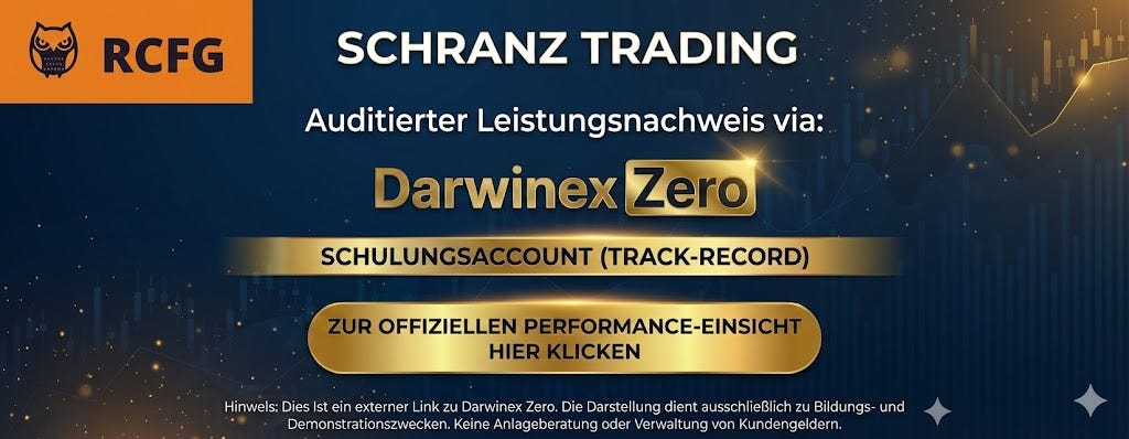 Um dir die Praxistauglichkeit unserer Schulungsinhalte zu demonstrieren, legen wir unsere Handelsentscheidungen offen. Wir verzichten dabei bewusst auf Screenshots und verweisen stattdessen auf unseren auditierten Track-Record beim externen Anbieter Darwinex Zero.